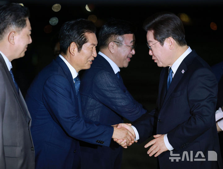 [성남=뉴시스] 고범준 기자 = 일본·미국 순방 일정을 마치고 귀국한 이재명 대통령이 28일 경기 성남 서울공항에서 정청래 더불어민주당 대표와 악수하고 있다. 2025.08.28. [email protected]