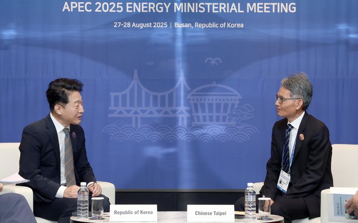 [서울=뉴시스] 이호현(왼쪽) 산업통상자원부 2차관이 28일 오전 부산 파라다이스호텔에서 라이첸신 대만 경제부 상무차관과 면담하고 있다. (사진=산업통상자원부 제공) 2025.08.28. [email protected] *재판매 및 DB 금지