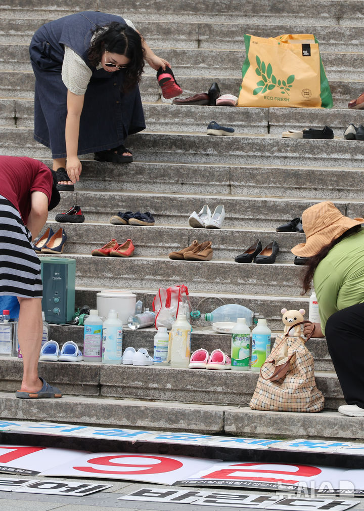 [서울=뉴시스] 김명원 기자 = 28일 오전 서울 종로구 광화문 세종문화회관 계단에서 환경보건시민센터, 가습기살균제 피해자와 유족 등이 태아, 영유아, 어린이 피해 추모위한 유품전시를 하고 있다. 2025.08.28. [email protected]
