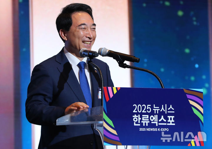 [서울=뉴시스] 김혜진 기자 = 박수현 국회 문화체육관광위원회 위원이 28일 오후 서울 중구 롯데호텔에서 열린 제7회 뉴시스 한류엑스포(2025 K-엑스포)에서 축사하고 있다. 2025.08.28. [email protected]