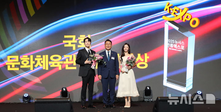 [서울=뉴시스] 김혜진 기자 = 김교흥(가운데) 국회 문화체육관광위원장이 28일 오후 서울 중구 롯데호텔에서 열린 제7회 뉴시스 한류엑스포(2025 K-엑스포)에서 배우 이준혁과 이주빈에게 국회 문화체육관광위원장상을 수여한 뒤 기념촬영 하고 있다. 2025.08.28. [email protected]