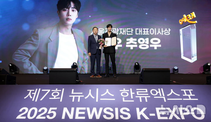 [서울=뉴시스] 조성우 기자 = 길기연(왼쪽) 서울관광재단 대표이사가 28일 서울 중구 롯데호텔에서 열린 제7회 뉴시스 한류엑스포(2025 K-엑스포)에서 배우 추영우에게 서울관광재단 대표이사상을 시상한 뒤 기념촬영하고 있다. 2025.08.28. [email protected]