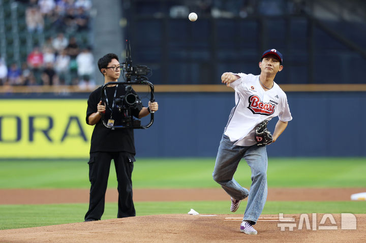 [서울=뉴시스] 권창회 기자 = 28일 서울 송파구 잠실야구장에서 열린 KBO리그 두산 베어스와 삼성라이온즈의 경기, 배우 장용원이 시구를 하고 있다. 2025.08.28. [email protected]