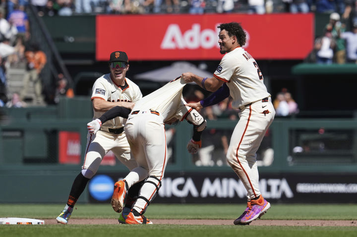 [샌프란시스코=AP/뉴시스] 샌프란시스코 자이언츠의 이정후(가운데)가 28일(현지 시간) 미 캘리포니아주 샌프란시스코 오라클 파크에서 열린 2025 메이저리그 시카고 컵스와의 경기 9회 말 1사 1,2루 3-3 상황에서 끝내기 적시타를 친 후 동료들의 축하를 받고 있다. 이정후는 4타수 2안타 1타점을 기록했고, 샌프란시스코는 4-3으로 승리하며 5연승을 기록했다. 2025.08.29.
