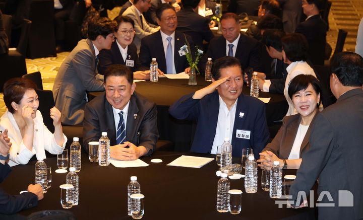 [인천=뉴시스] 조성봉 기자 = 정청래 더불어민주당 대표가 29일 인천 중구 파라다이스시티 컨벤션센터 그랜드볼룸에서 열린 2025년 정기국회 대비 민주당 국회의원 워크숍에서 김병주 최고위원에게 거수 경례를 하고 있다. 2025.08.29. [email protected]