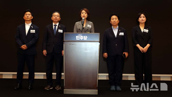 [인천=뉴시스] 조성봉 기자 = 고민정 더불어민주당 의원을 비롯한 교육위 소속 의원들이 29일 인천 중구 파라다이스시티 컨벤션센터에서 열린 2025 정기국회 더불어민주당 국회의원 워크숍 중 기자회견을 열고 이배용 국가교육위원회 위원장 사퇴를 촉구하고 있다. 2025.08.29. [email protected]