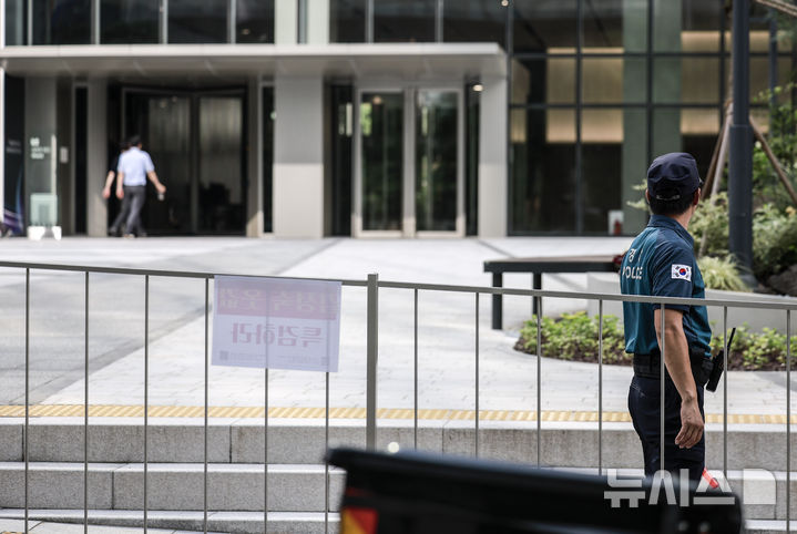 [서울=뉴시스] 정병혁 기자 = 29일 서울 종로구 김건희 특검팀(특별검사 민중기) 사무실 앞에 경찰이 근무를 서고 있다. 김건희 특검팀은 이날 특정범죄가중처벌법상 알선수재, 자본시장법 및 정치자금법 위반 혐의로 김건희 여사를 서울중앙지법에 구속 기소했다고 밝혔다. 2025.08.29. [email protected]