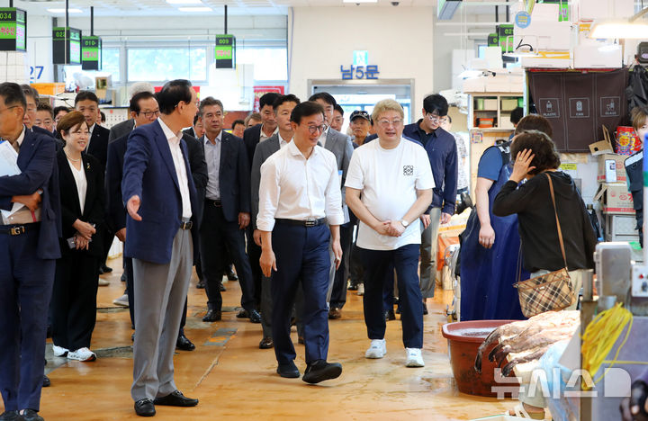 [서울=뉴시스] 김혜진 기자 = 전재수 해양수산부 장관과 노동진 수협중앙회장을 비롯한 조합장들이 29일 서울 동작구 노량진수산시장에서 수산물 물가 동향 점검하며 시민들과 대화를 나누고 있다. 2025.08.29. [email protected]