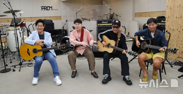 [서울=뉴시스] 김혜진 기자 = 쎄시봉 원년멤버 가수 윤형주(왼쪽부터), 송창식, 조영남, 김세환이 29일 오후 서울 마포구의 한 연습실에서 공연 연습에 앞서 포즈를 취하고 있다.