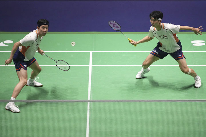 [파리=AP/뉴시스] 김원호(오른쪽)와 서승재가 29일(현지 시간) 프랑스 파리 아디다스 아레나에서 열린 2025 세계배드민턴연맹(BWF) 세계선수권대회 남자 복식 8강전에서 티 카이운-청 만웨이 조(말레이시아)와 경기하고 있다. 김원호-서승재가 2-1(23-21 21-23 21-15)로 승리하고 4강에 올랐다. 2025.08.30.
