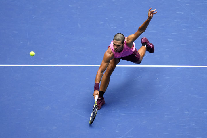 [뉴욕=AP/뉴시스] 카를로스 알카라스(2위·스페인)가 29일(현지 시간) 미국 뉴욕의 빌리진킹 내셔널 테니스 센터에서 열린 US 오픈 남자 단식 3회전에서 루치아노 다르데리(34위·이탈리아)와 경기하고 있다. 알카라스가 3-0(6-2 6-4 6-0)으로 완승하고 16강에 올랐다. 2025.08.30.