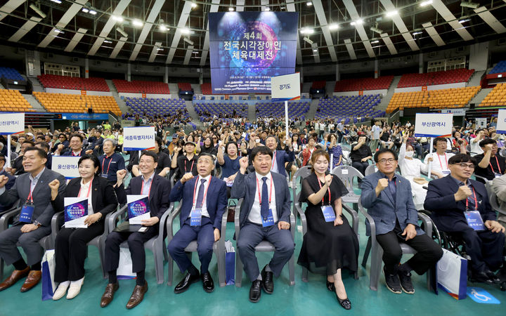 [서울=뉴시스] 정병혁 기자 = 29일 경기 수원시 수원종합운동장 실내체육관에서 열린 제4회 전국시각장애인체육대제전 개회식에서 참석자들이 기념촬영을 하고 있다.(사진=한국시각장애인스포츠연멩 제공) 2025.08.30. [email protected] *재판매 및 DB 금지