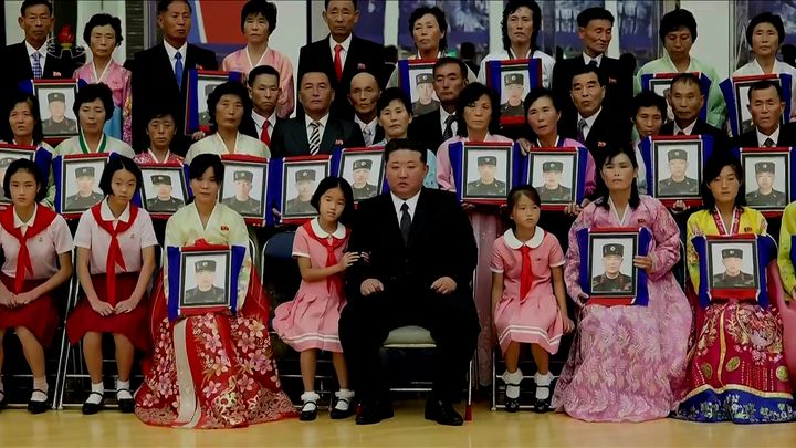러시아 파병 희생자 유가족들과 기념촬영 하는 김정은