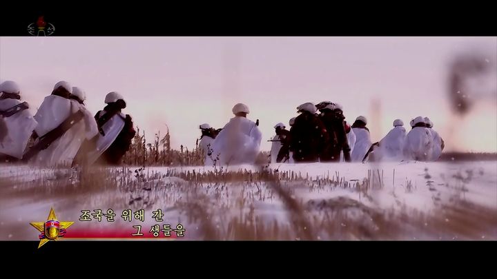 [서울=뉴시스] 북한 조선중앙TV가 30일 러시아-우크라이나 전쟁에 파병된 북한군 찬양 뮤직비디오 '기억하리'를 공개했다. (사진=조선중앙TV 캡쳐) 2025.08.30. [email protected] *재판매 및 DB 금지