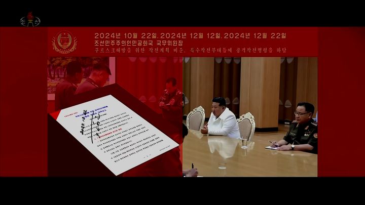조선중앙TV는 이 뮤직비디오에서 김정은 국무위원장이 북한군의 러시아 쿠르스크에 파병을 공식 결정한 시점과 지난해 10월과 12월 세 차례에 걸쳐 북한 특수작전부대에 직접 공격 명령을 하달한 문서를 공개했다. (사진=조선중앙TV 캡쳐) 2025.08.30. [email protected] *재판매 및 DB 금지
