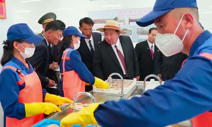 [서울=뉴시스] 김정은 북한 국무위원장이 지난 30일 함경남도 낙원군에 세워진 대규모 바다 양식기지인 낙원군바닷가양식사업소 준공식에 참석했다고 조선중앙TV가 31일 보도했다. (사진=조선중앙TV 캡쳐) 2025.08.31. [email protected] *재판매 및 DB 금지