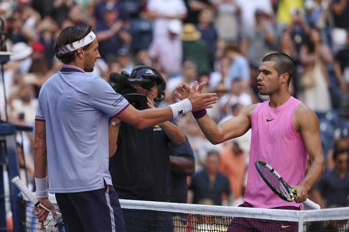 [뉴욕=AP/뉴시스] 카를로스 알카라스(2위·스페인, 오른쪽)가 지난달 31일(현지 시간) 미국 뉴욕의 빌리진킹 내셔널 테니스 센터에서 열린 US 오픈 남자 단식 16강전에서  아르투르 린더크네흐(82위·프랑스)를 물리친 후 인사를 나누고 있다. 알카라스가 3-0(7-6 6-3 6-4)으로 승리하고 8강에 올랐다. 2025.09.01.