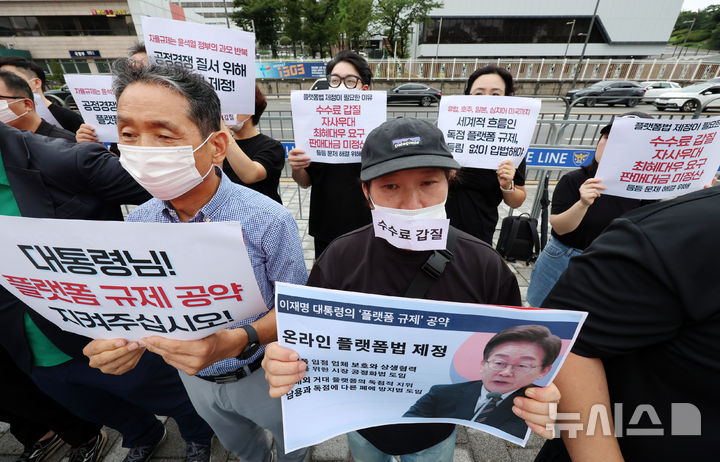[서울=뉴시스] 조성우 기자 = 중소상인·자영업자·노동자·시민사회단체의 연대체인 온라인플랫폼법 제정촉구 공동행동이 1일 오전 서울 용산구 대통령실 인근에서 '민생 죽이는 플랫폼 갑질 더 이상 못 참는다, 이재명 대통령은 온플법 제정 약속하라!' 기자회견을 열고 온라인플랫폼법 제정을 촉구하고 있다. 2025.09.01. [email protected]
