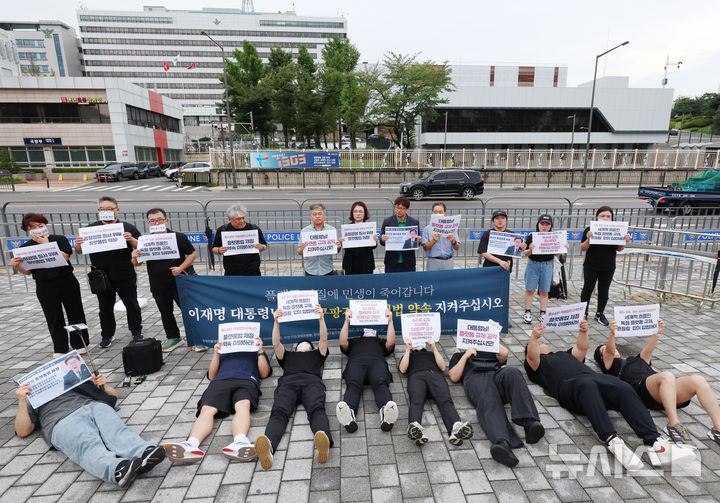 [서울=뉴시스] 조성우 기자 = 중소상인·자영업자·노동자·시민사회단체의 연대체인 온라인플랫폼법 제정촉구 공동행동이 1일 오전 서울 용산구 대통령실 인근에서 '민생 죽이는 플랫폼 갑질 더 이상 못 참는다, 이재명 대통령은 온플법 제정 약속하라!' 기자회견을 열고 온라인플랫폼법 제정을 촉구하는 퍼포먼스를 하고 있다. 2025.09.01. [email protected]