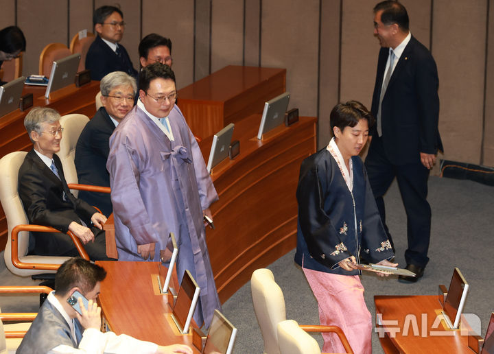 [서울=뉴시스] 고승민 기자 = 한복을 입은 개혁신당 이준석 대표와 천하람 원내대표가 1일 서울 여의도 국회에서 열린 제429회 국회(정기회) 제1차 본회의에 출석하고 있다. 2025.09.01. [email protected]