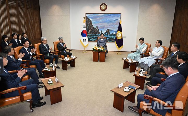 [서울=뉴시스] 국회사진기자단 = 우원식 국회의장이 1일 서울 여의도 국회에서 제429회 국회 (정기회) 개회식에 앞서 사전환담을 하고있다. 2025.09.01. [email protected]