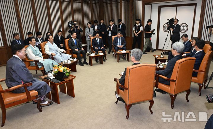 [서울=뉴시스] 국회사진기자단 = 우원식 국회의장이 1일 서울 여의도 국회에서 제429회 국회 (정기회) 개회식에 앞서 사전환담을 하고있다. 2025.09.01. [email protected]