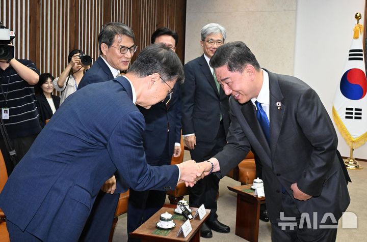 [서울=뉴시스] 국회사진기자단 = 김병기 더불어민주당 원내대표가 1일 서울 여의도 국회에서 제429회 국회 (정기회) 개회식에 앞서 열린 사전환담에서 최재해 감사원장과 인사하고 있다. 2025.09.01. [email protected]