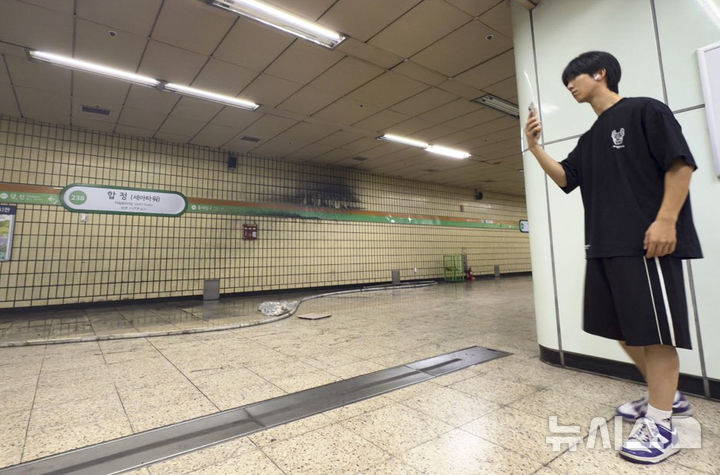 [서울=뉴시스] 김근수 기자 = 서울 지하철 합정역에 화재가 발생한 가운데 1일 오후 서울 마포구 서울지하철 2호선 합정역 승강장 벽이 검게 그을려 있다.