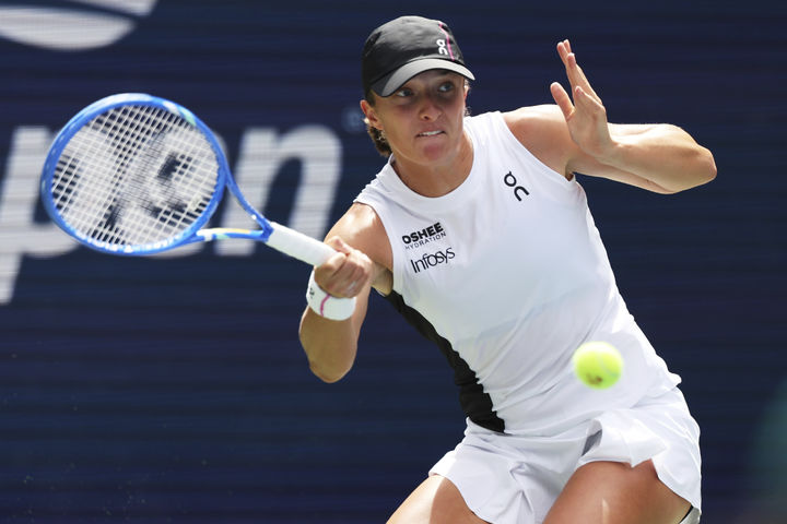 [뉴욕=AP/뉴시스] 이가 시비옹테크(2위·폴란드)가 1일(현지 시간) 미국 뉴욕의 빌리진킹 내셔널 테니스 센터에서 열린 US 오픈 여자 단식 16강전에서 예카테리나 알렉산드로바(12위·러시아)와 경기하고 있다. 시비옹테크가 2-0(6-3 6-1)으로 승리하고 8강에 올랐다. 2025.09.02.
