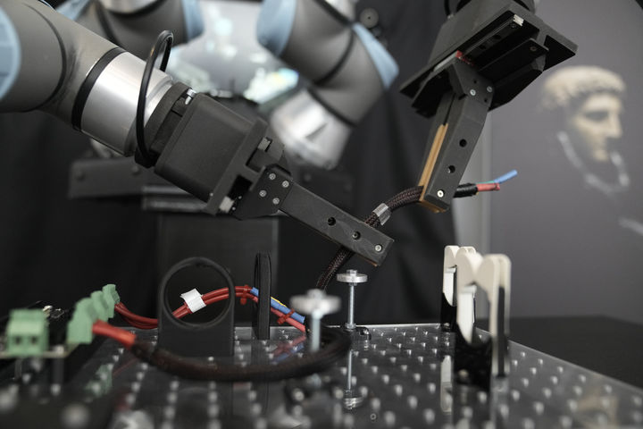 [올림피아=AP/뉴시스] 1일(현지 시간) 그리스 올림피아의 올림픽 아카데미에서 열린 제1회 국제 휴머노이드 올림피아드에서 한 로봇이 전기 배선 작업을 하고 있다. 2025.09.02.