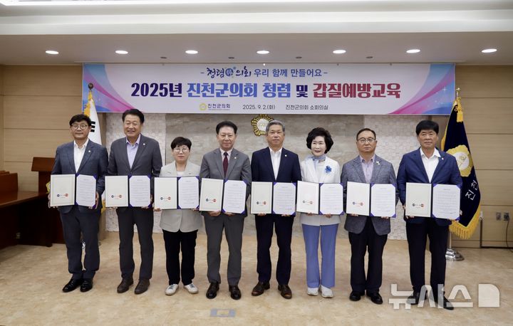 [진천=뉴시스] 이재명(오른쪽 네 번째) 충북 진천군의회 의장을 포함해 의원 8명 전원이 2일 군의회 소회의실에서 부패방지 및 갑질예방 교육에 앞서 청렴실천 서약서에 서명한 뒤 기념촬영을 하고 있다. (사진=진천군 제공) 2025.09.02. [email protected]