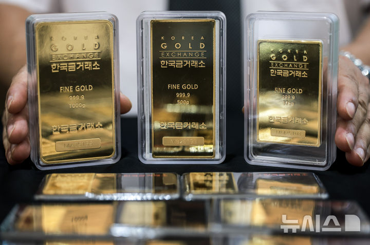 [서울=뉴시스] 정병혁 기자 = 2일 서울 종로구 한국금거래소 종로본점에 골드바가 놓여 있다.