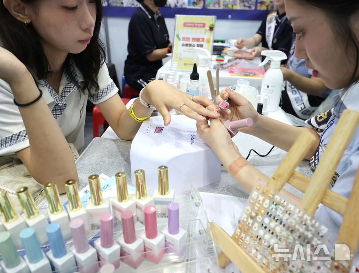 [고양=뉴시스] 전진환 기자 = 2일 오전 경기도 고양시 킨텍스에서 열린 2025 경기도교육청 직업계고 취창업박람회 분당아람고등학교에서 한 학생이 네일아트를 받고 있다. 2025.09.02. [email protected]