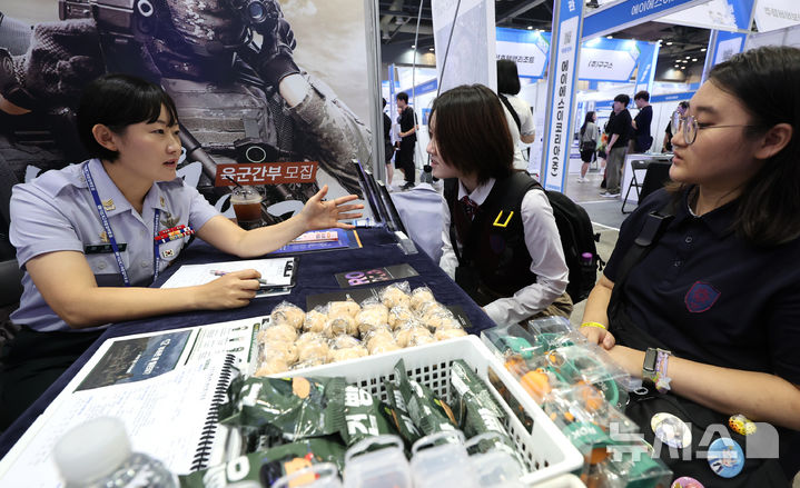 [고양=뉴시스] 전진환 기자 = 2일 오전 경기도 고양시 킨텍스에서 열린 2025 경기도교육청 직업계고 취창업박람회를 찾은 학생들이 육군인사사령부 부스에서 부사관 및 장교 취업설명을 듣고 있다.  2025.09.02. [email protected]