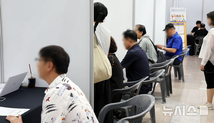 [부산=뉴시스] 하경민 기자 = '2025 부산 장애인 진로·취업 박람회'가 열린 2일 부산 연제구 부산시청 로비에서 장애인 구직자들이 구인업체 현장면접을 보고 있다.