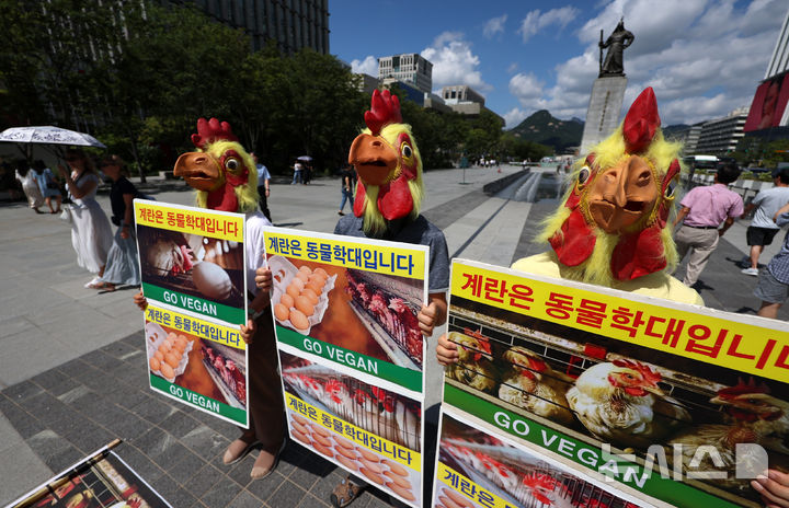 [서울=뉴시스] 조성우 기자 = 한국비건채식협회 회원들이 2일 오후 서울 종로구 광화문광장에서 '잔인한 동물학대 케이지 계란을 중단하고 비건(VEGAN) 채식을 촉구'하는 기자회견에서 닭 가면을 쓰고 퍼포먼스를 하고 있다. 2025.09.02. [email protected]