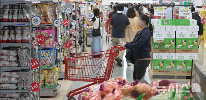 석유류 가격이 낮은 수준을 유지하고 SK텔레콤이 통신요금을 큰 폭으로 할인한 영향이지만 농축수산물 가격은 작년 7월(5.5%) 이후 13개월 만에 가장 큰 폭으로 올랐다. 2일 서울 소재 유통매장에서 소비자들이 쇼핑을 하고 있다. 2025.09.02. [email protected]