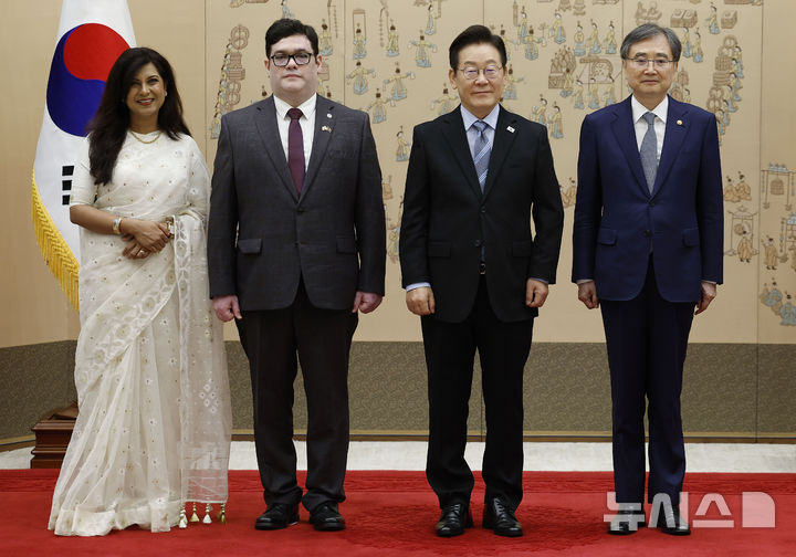 [서울=뉴시스] 최동준 기자 = 이재명 대통령이 2일 서울 용산 대통령실 청사에서 열린 주한대사 신임장 제정식에서 토피크 이슬람 샤틸(왼쪽 두번째) 주한 방글라데시 대사로부터 신임장을 전달받은 뒤 기념촬영하고 있다. 오른쪽은 조현 외교부 장관. 2025.09.02. [email protected]