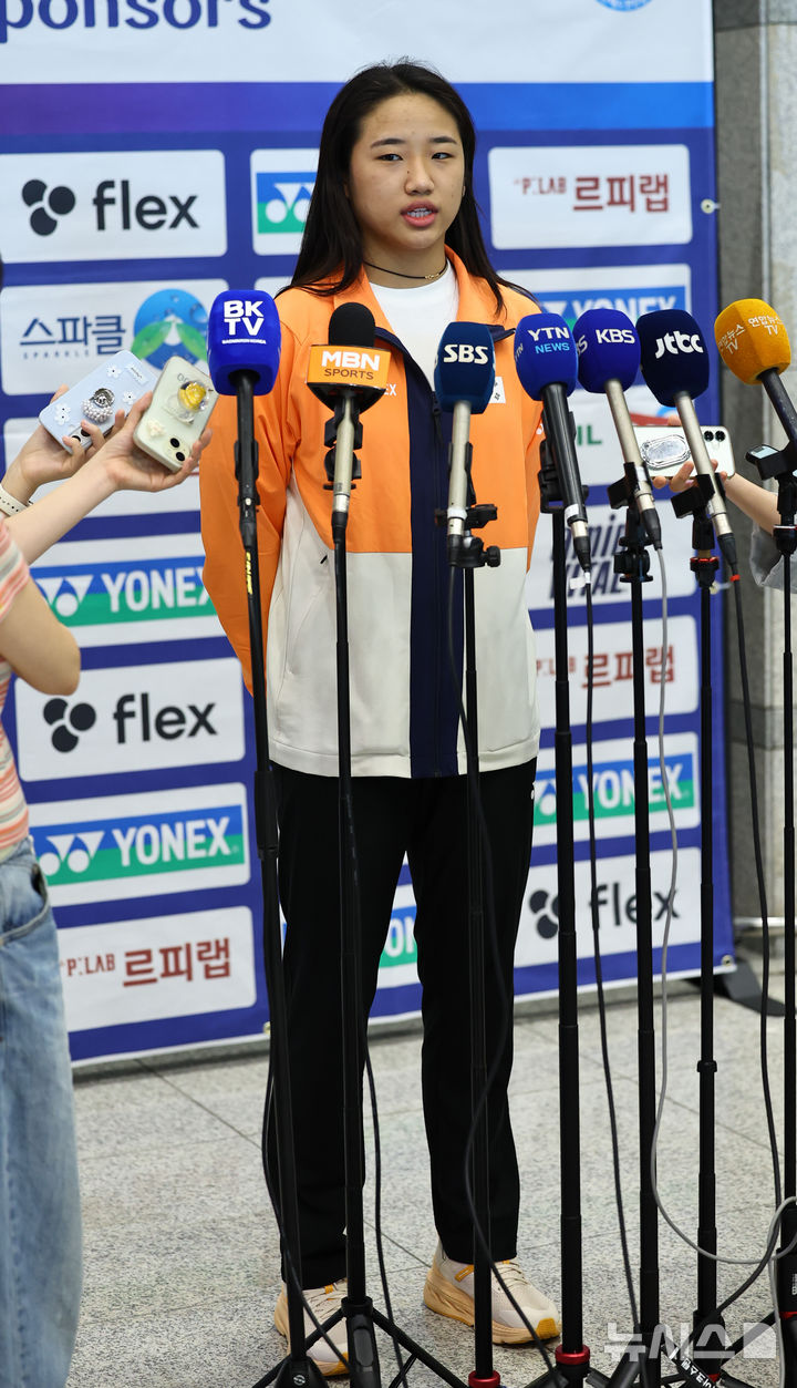 [인천공항=뉴시스] 최진석 기자 = '2025 세계개인배드민턴선수권대회'를 마치고 귀국한 안세영이 2일 오후 인천국제공항 제1터미널에서 인터뷰를 하고 있다.