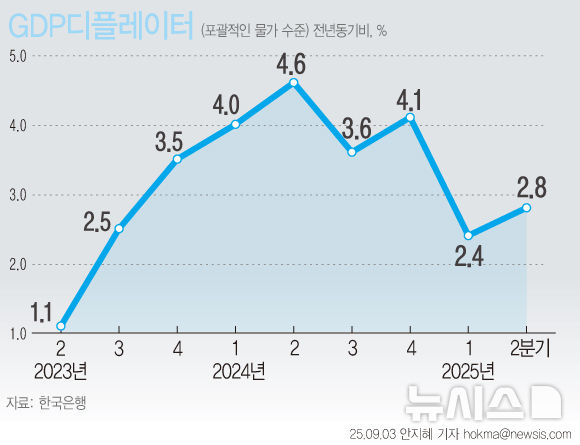 [서울=뉴시스] 한국은행이 3일 발표한 '2025년 2분기 국민소득(잠정)'에 따르면 2분기 GDP디플레이터는 전년 동기 대비 2.8% 상승했다. GDP디플레이터는 명목GDP를 실질GDP로 나눈 값으로 수출입 등까지 포괄하는 전반적인 물가 수준을 나타낸다. 총저축률(35.6%)은 전기대비 0.7%포인트 올랐다. (그래픽=안지혜 기자)