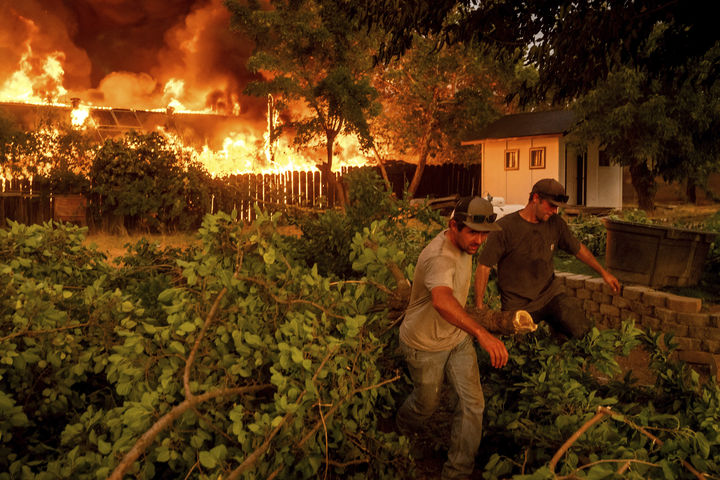 [차이니스 캠프=AP/뉴시스] 2일(현지 시간) 미 캘리포니아주 투올러미 카운티 차이니스 캠프에서 주민들이 ‘6-5 파이어' 산불이 집으로 번지는 것을 막기 위해 주변 나무를 베어내고 있다. 2025.09.03.
