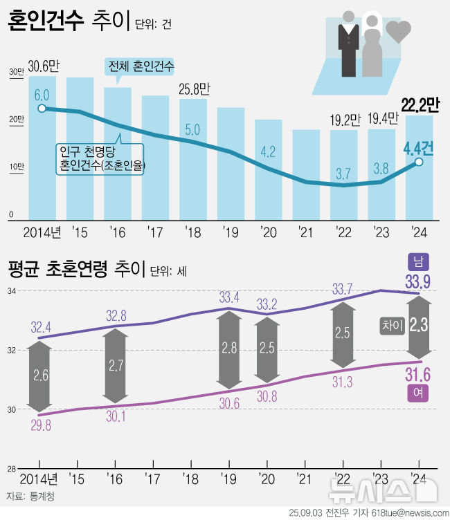 [서울=뉴시스] 3일 통계청에 따르면 지난해 평균초혼연령은 남자가 33.9세, 여자는 31.6세로 1995년 대비 각각 5.5세, 6.2세 상승했다. 인구 1000명당 혼인건수를 의미하는 조혼인율은 지난해 4.4건으로 30년 전보다 4.3건 감소한 것으로 집계됐다. (그래픽=전진우 기자)
