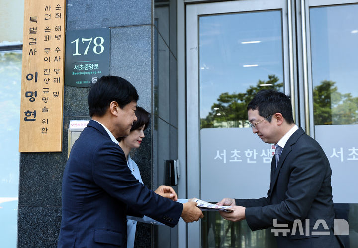 [서울=뉴시스] 최진석 기자 = 국회 법사위 이성윤(왼쪽) 더불어민주당 의원과 박은정 조국혁신당 의원이 3일 서울 서초구 이명현 순직해병 특별검사팀 사무실 앞에서 정민영(오른쪽) 특검보에게 국회증언감정법위반 관련 고발장을 전달하고 있다. 2025.09.03. [email protected]