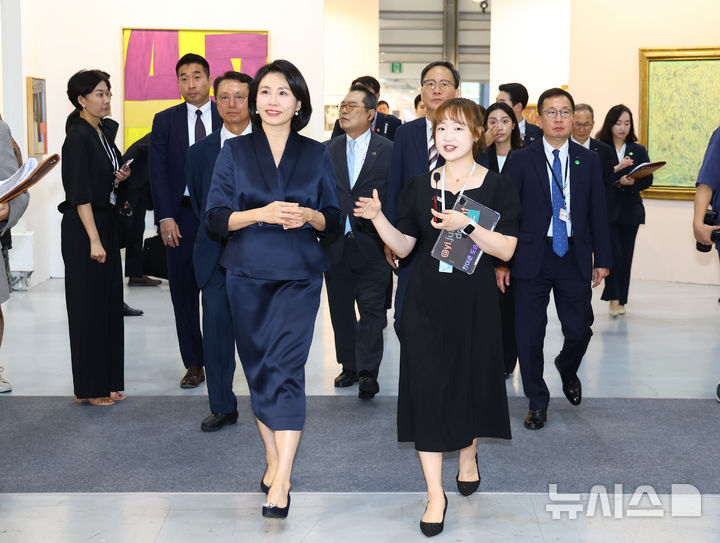 [서울=뉴시스] 황준선 기자 = 이재명 대통령 부인 김혜경 여사가 3일 서울 강남구 코엑스에서 열린 국내최대 아트페어 '키아프 서울(Kiaf SEOUL)'을 찾아 전시를 둘러보고 있다. 2025.09.03. [email protected]