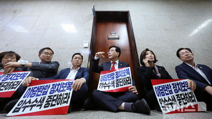 [서울=뉴시스] 김금보 기자 = 송언석 국민의힘 원내대표 등 의원들이 3일 서울 여의도 국회 국민의힘 원내대표실 앞에서 특검의 압수수색에 대항하는 농성을 하고 있다. 2025.09.03. [email protected]