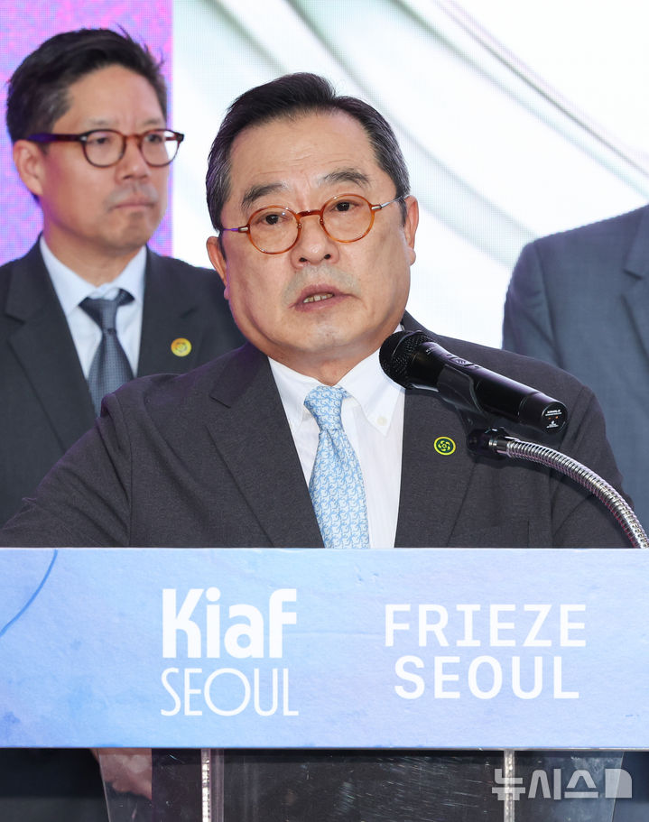 [서울=뉴시스] 황준선 기자 = Kiaf 조직위원장 구자열 LS 홀딩스 이사회 의장이 3일 서울 강남구 코엑스에서 열린 국내최대 아트페어 '키아프 서울(Kiaf SEOUL)'과 세계 3대 아트페어 '프리즈 서울(FRIEZE SEOUL)' 개막식에 참석해 개회사를 하고 있다. 2025.09.03. [email protected]