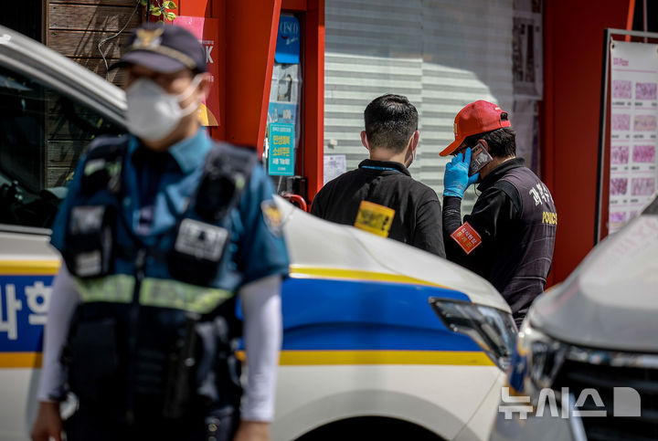 [서울=뉴시스] 정병혁 기자 = 3일 서울 관악구 조원동 칼부림 사건 현장에서 과학수사대가 현장조사를 하고 있다.