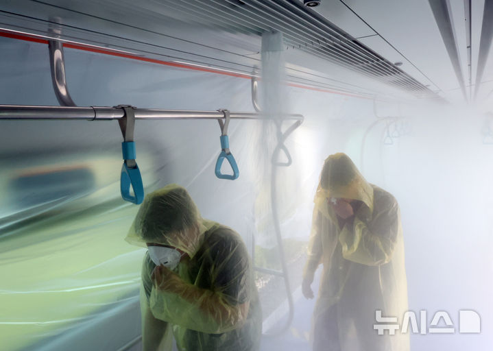 [인천=뉴시스] 전진환 기자 = 3일 오후 미분무소화설비(물을 미세한 입자로 분무하는 화재진압장치)를 이용한 무인 전동차 화재진압 시연회가 실시된 인천 남동구 인천교통공사 운연차량사업소에서 화재 전동차 천장에 설치된 노즐에서 미분무소화액이 분사되고 있다. 이번 시연은 전동차 화재시 미분무소화설비의 동작을 통해 짧은 시간 내에 초기 진압 능력을 검증하기 위해 마련됐다.