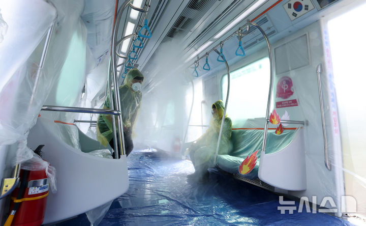 [인천=뉴시스] 전진환 기자 = 3일 오후 미분무소화설비(물을 미세한 입자로 분무하는 화재진압장치)를 이용한 무인 전동차 화재진압 시연회가 실시된 인천 남동구 인천교통공사 운연차량사업소에서 화재 전동차 천장에 설치된 노즐에서 미분무소화액이 분사되고 있다. 이번 시연은 전동차 화재시 미분무소화설비의 동작을 통해 짧은 시간 내에 초기 진압 능력을 검증하기 위해 마련됐다.