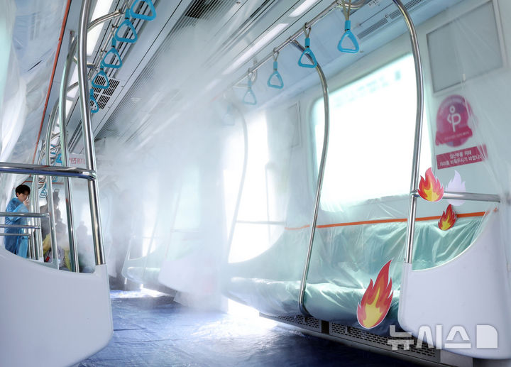 [인천=뉴시스] 전진환 기자 = 3일 오후 미분무소화설비(물을 미세한 입자로 분무하는 화재진압장치)를 이용한 무인 전동차 화재진압 시연회가 실시된 인천 남동구 인천교통공사 운연차량사업소에서 화재 전동차 천장에 설치된 노즐에서 미분무소화액이 분사되고 있다. 이번 시연은 전동차 화재시 미분무소화설비의 동작을 통해 짧은 시간 내에 초기 진압 능력을 검증하기 위해 마련됐다.